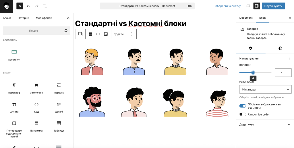 Стандартні блоки як правило добре інтегровані в інтерфейс WordPress, нижче як приклад – блок галерея та одразу можливість змінити чимало налаштувань у панелі властивостей.