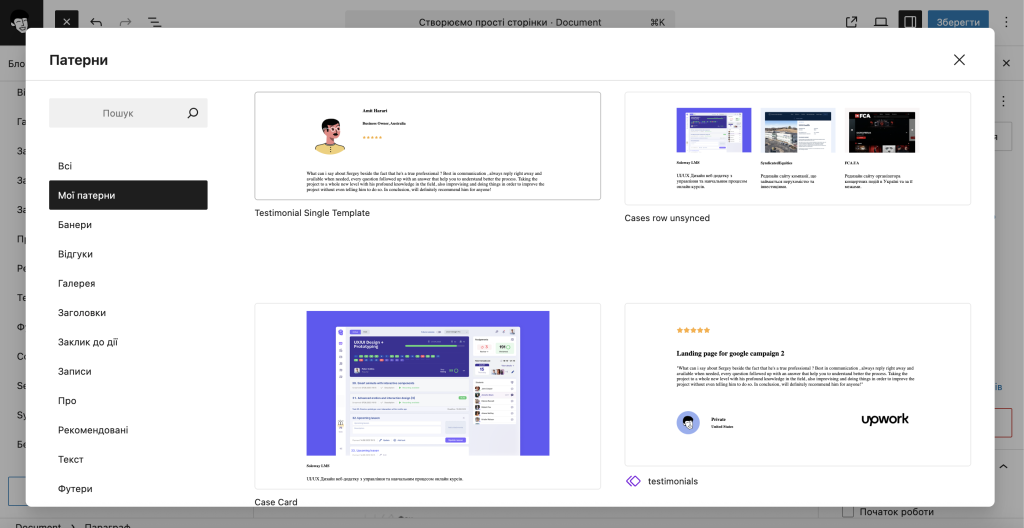 - Перші (синхронізовані) – повторюються у всіх місцях, де були додані (наприклад, хедер та футер могли б бути синхронізованими патернами, адже вони не змінюються та у разі редагування потрібно було б редагувати кожне місце з їх наявністю)