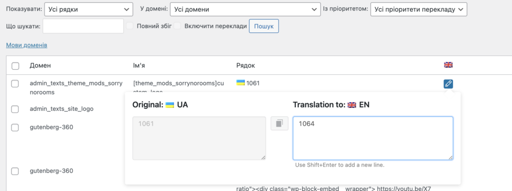 - string translation > лого, вмикаємо і в перекладі вказуємо ID (1064 – в цьому прикладі)